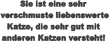 Sie hat einen sehr ausgeprägten Spieltrieb und ist total neugierig. Mit zwei Jahren hatte sie ihre ersten Babys. Sie ist eine ganz fürsorgliche Katzenmama! |