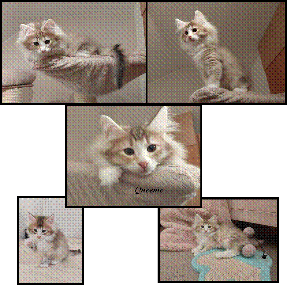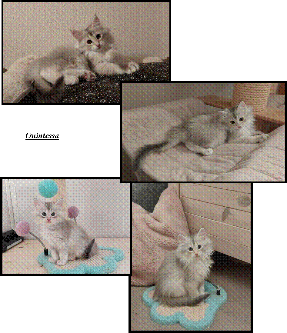 Quincy black smoke white booked Queenie amber silver torbie ticked available Queen Mary black silver torbie cl. white available Quinta black silver spotted available Quintessa light amber silver ticked white available